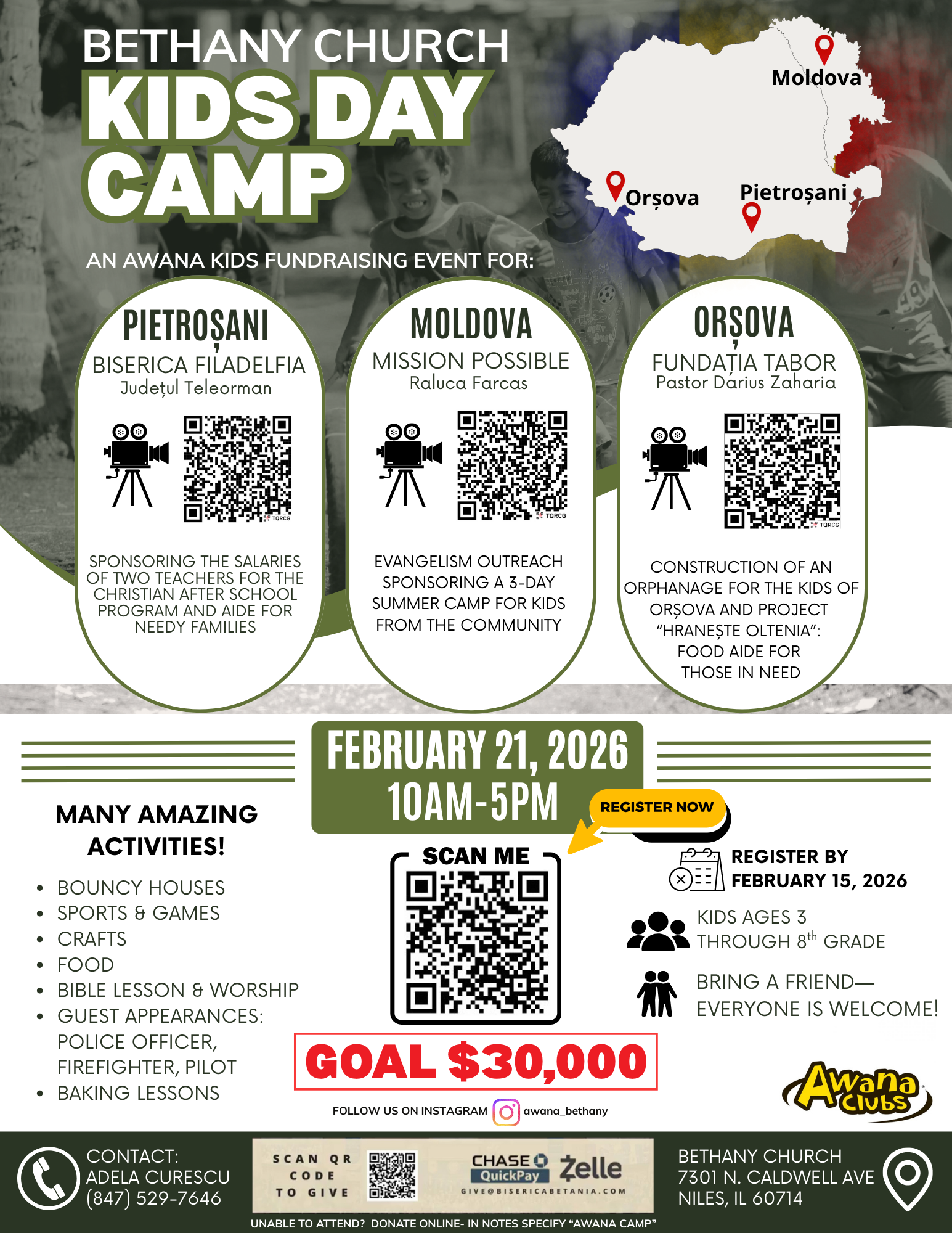 - Toți copiii din Biserica Betania sunt invitați să participe pe 21 februarie la o tabără specială de o zi întreagă, cu multe activități interesante. Fondurile strânse în cadrul acestei tabere vor fi folosite pentru diverse cauze în Pietroșani, Orșova și Moldova. Vă rugăm să scanați codul QR pentru a viziona videoclipuri cu fiecare organizație și cum putem face cu toții o diferență. Ridicați invitațiile din holul bisericii. Puteţi să invitați şi prietenii de la școală sau din alte biserici să participe. Toată lumea este binevenită. Înscrierile se încheie pe 15 februarie. Click aici pentru înscriere.